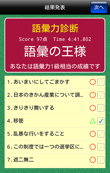 「語彙力診断」では正解率により出題レベルが変動します。 |