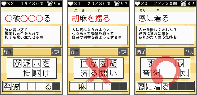 表示される漢字を正しい順番に並べて、三字熟語を作るゲームです。