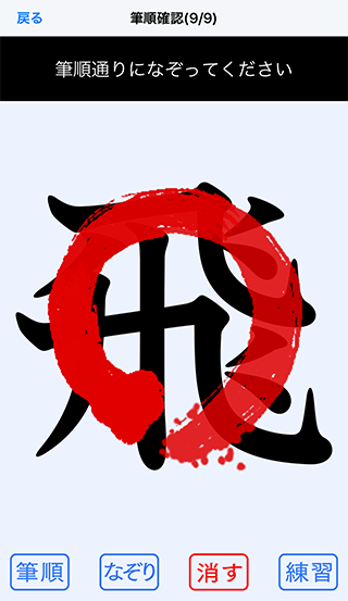 「なぞり」ボタンを押すとなぞり練習ができます。 次に書くべき画が赤色で表示されるので順番になぞって練習してください。 |