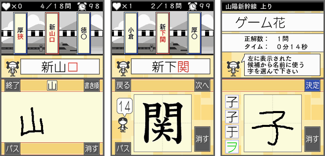 表示される漢字を正しい順番に並べて、三字熟語を作るゲームです。